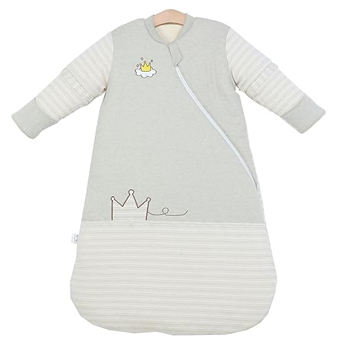 Ein Schlafsack mit Ärmeln ist ein Schlafsack, der zusätzlich zu den Beinen auch die Arme des Babys bedeckt. Dadurch ist das Baby noch wärmer und sicherer eingepackt.